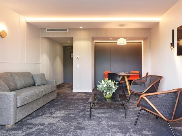 Choose absolute comfort with our 65 m² Mouratoglou Suite. Spacious and bright, it features a living room with a sofa bed, a bedroom with a large double bed and a fully-equipped bathroom.